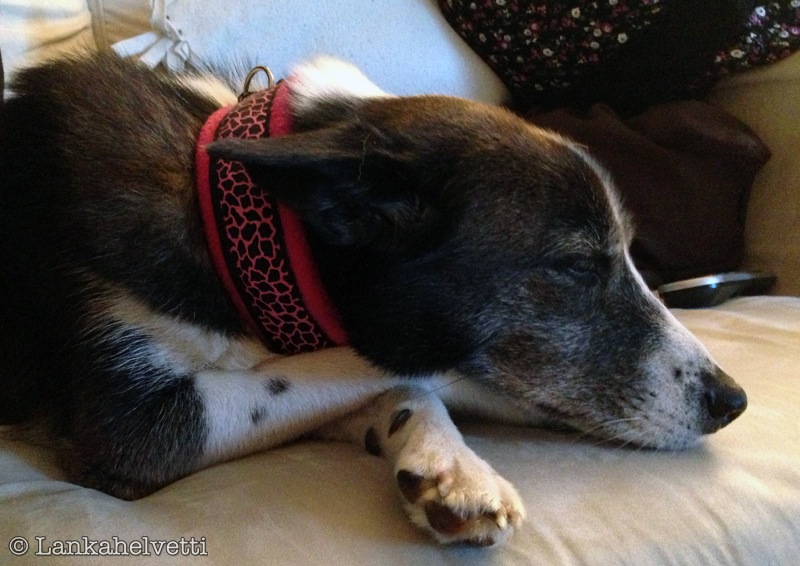 Kävin eilen ystäväni vanhempien luona ja vein tuliaisiksi Nelli-koiralle pannan ja sytykeruusuja. Sytykeruusut päätyi koristeeksi, kun eihän niitä kuulema raaski polttaa. Nelli sai pannan kaulaansa samantein